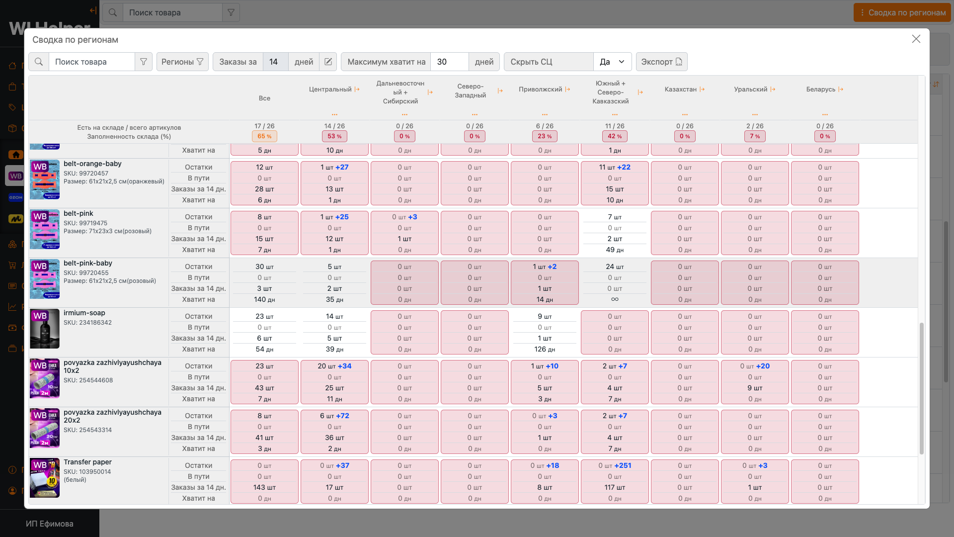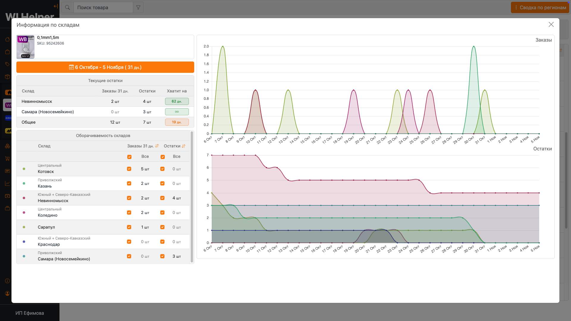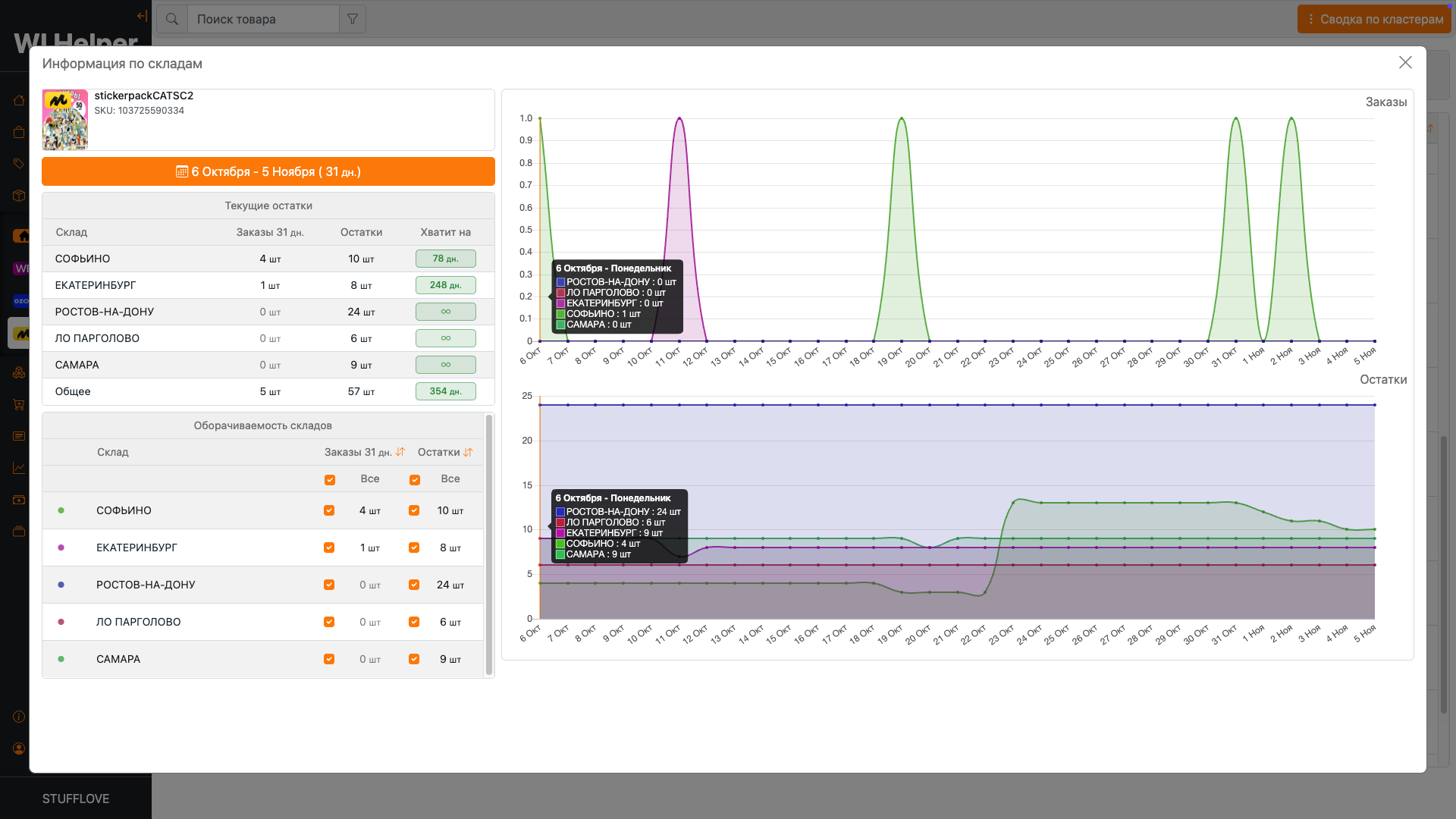 Возможность следить за остатками товаров на складах маркетплейсов и прогнозировать на сколько хватит ваших товаров. Анализ загруженности складов и регионов.