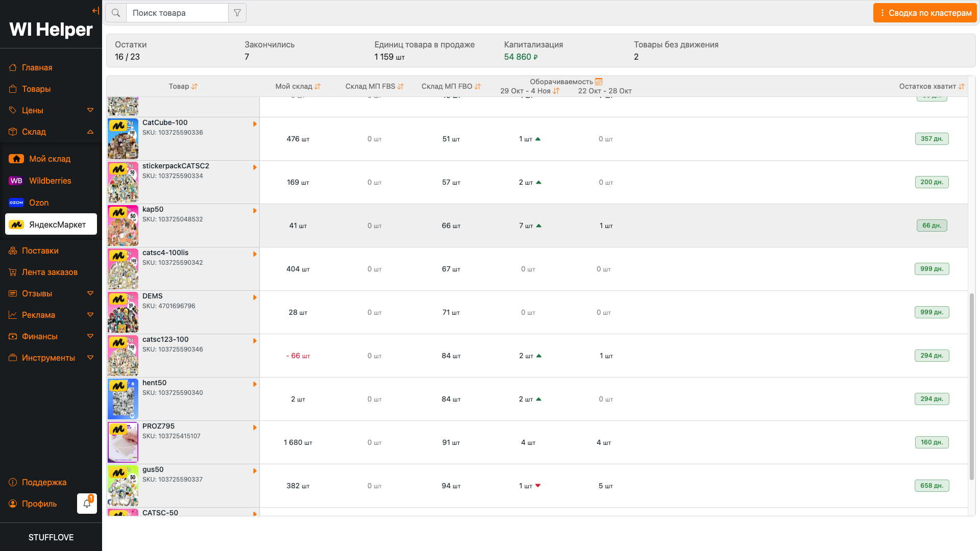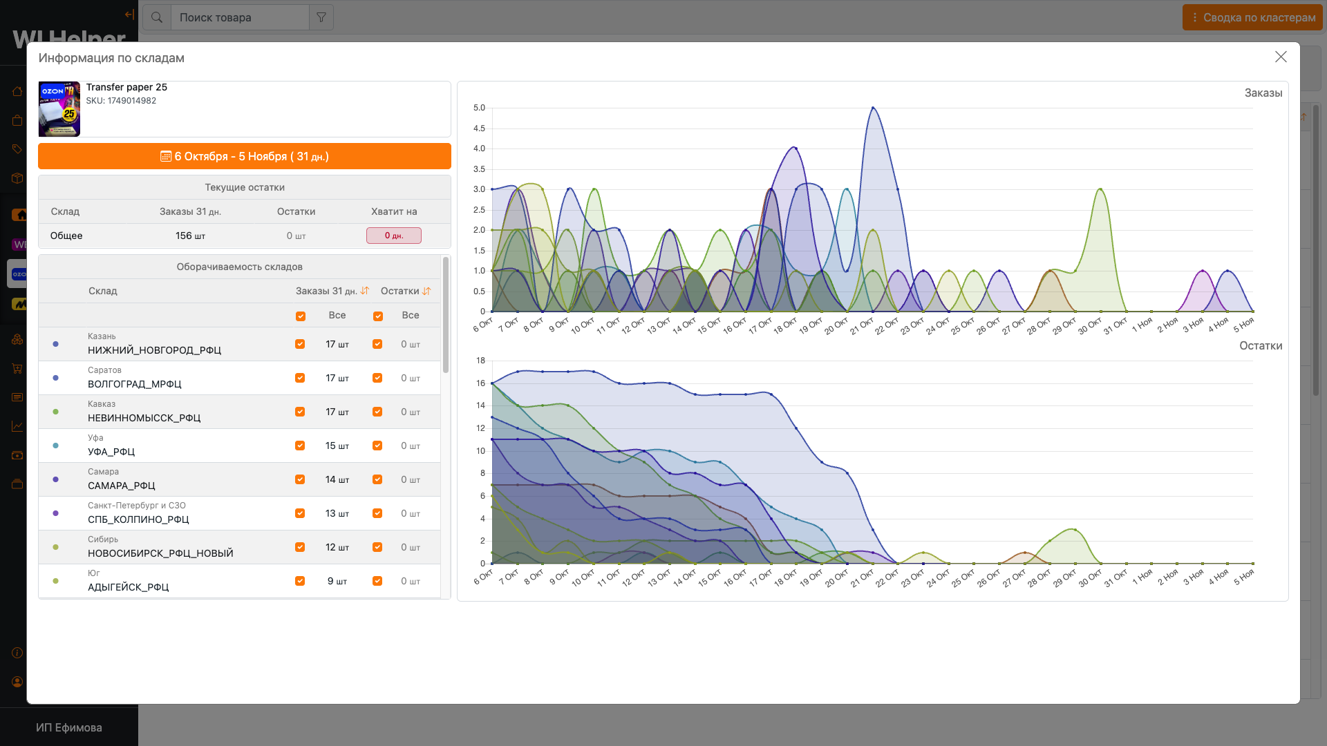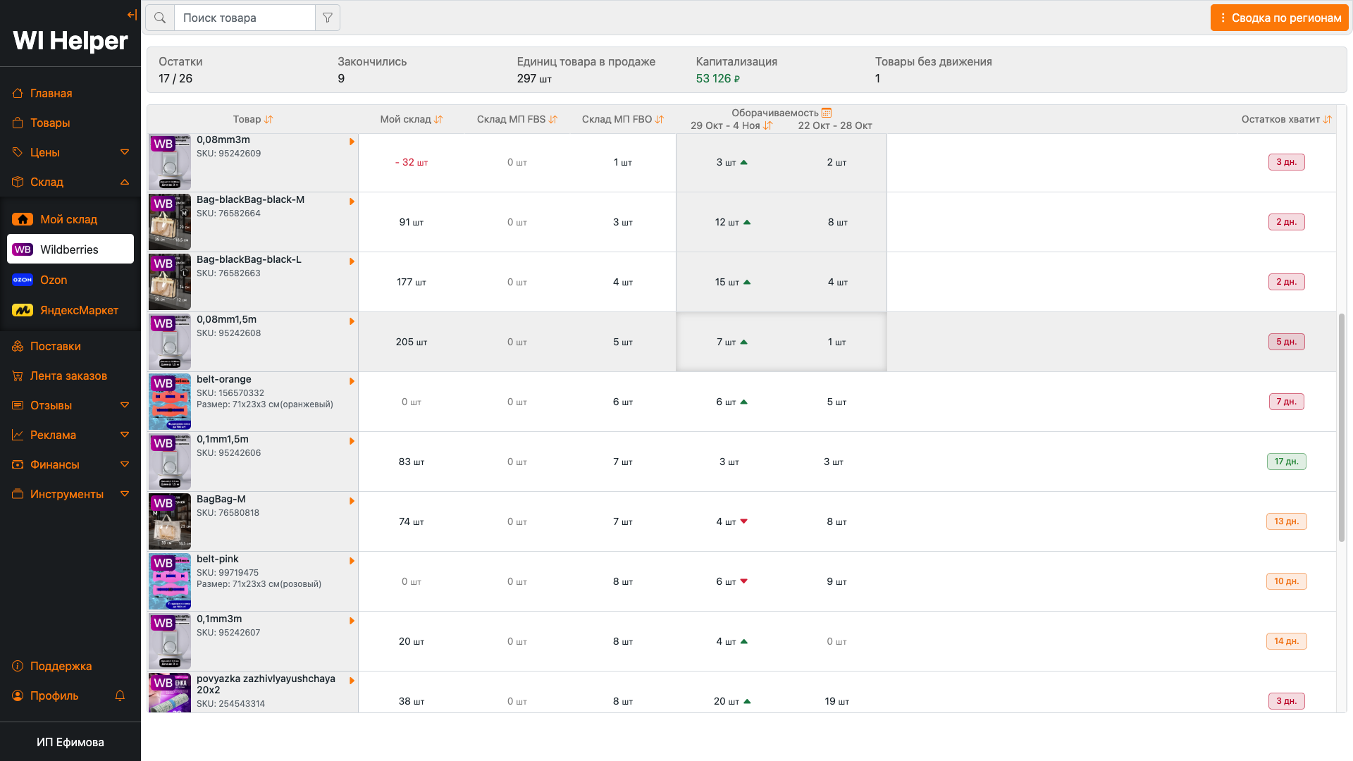 Возможность следить за остатками товаров на складах маркетплейсов и прогнозировать на сколько хватит ваших товаров. Анализ загруженности складов и регионов.