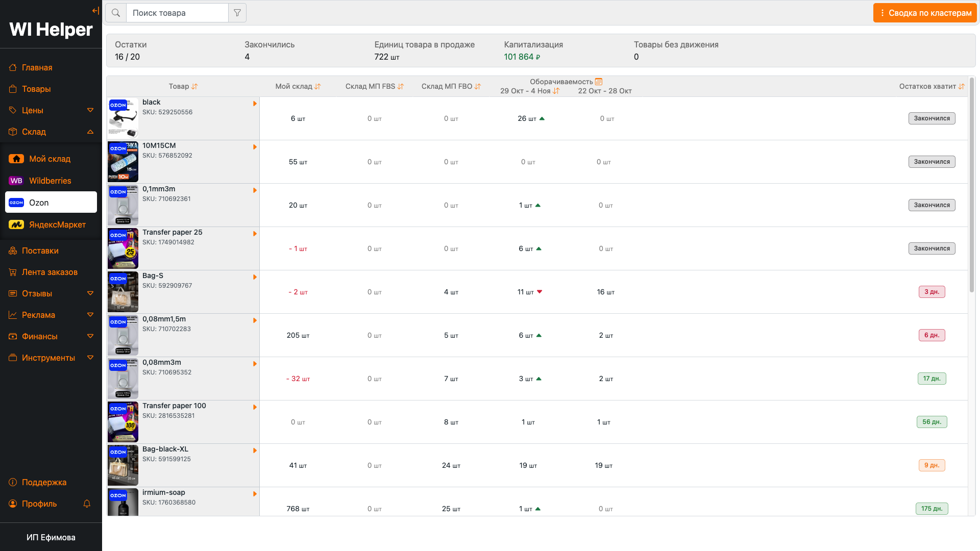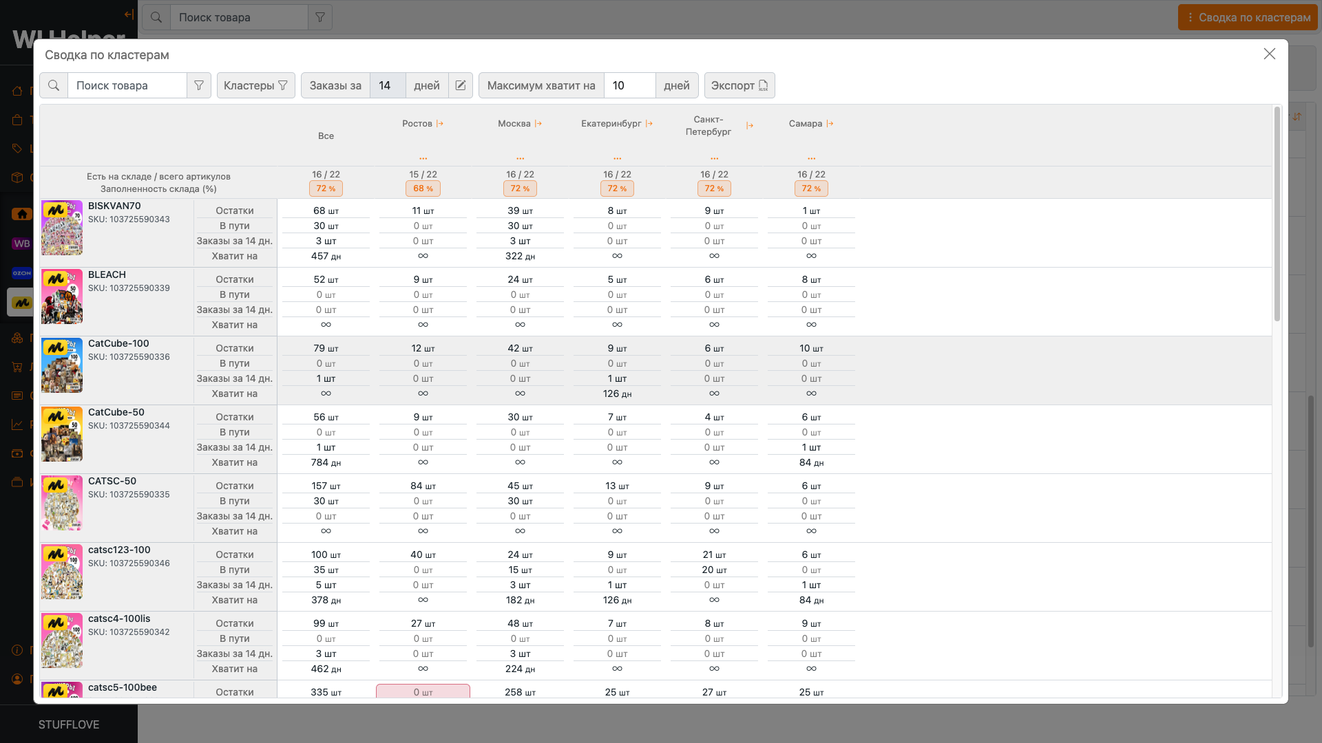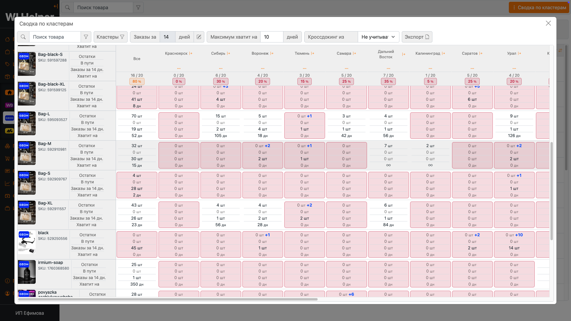 Анализ остатков по кластерам и регионамВ одной таблице собрана информация по остаткам, товарам в пути, оборачиваемости и прогнозу, на сколько хватит товаров