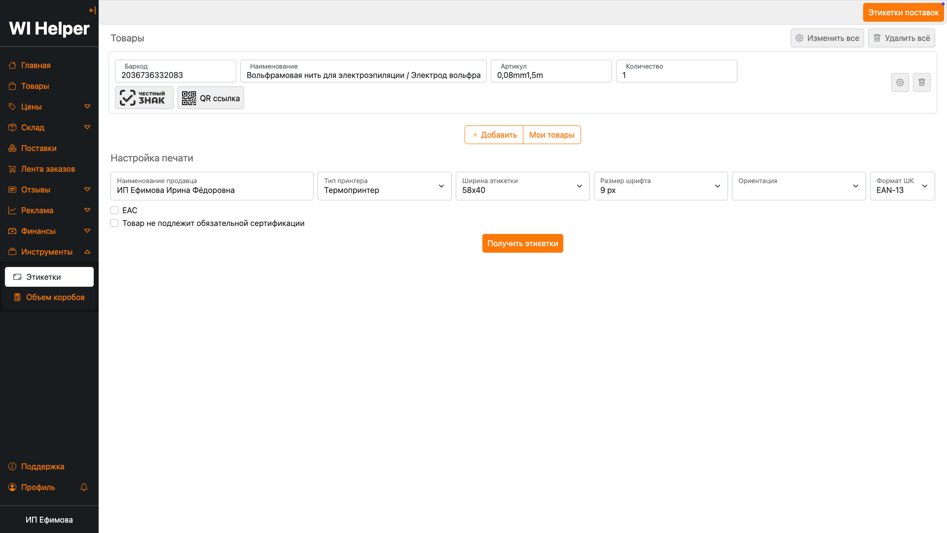 Заполнение поставок на маркетплейсы в удобном интерфейсе, со всеми полезными инструментами - от печати этикеток до калькулятора коробов. Быстрая выгрузка готовых EXCEL файлов.