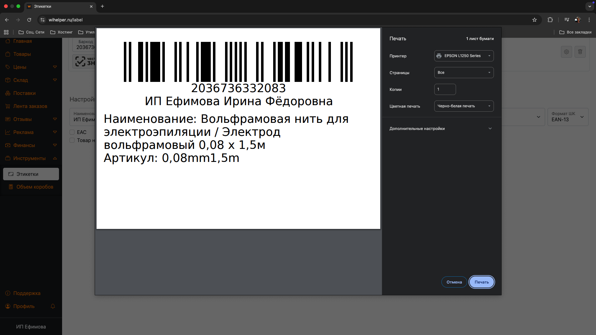 Выберите товары и укажите количество. Данные о штрихкоде, наименовании и артикуле заполнятся автоматически. Печатайте на термопринтере или обычном принтере формата А4.